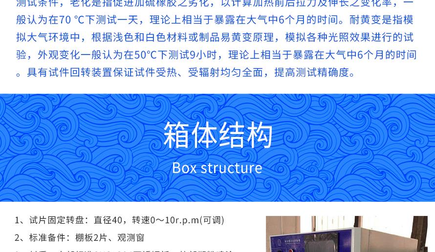 產(chǎn)品型號:JQ-876 品牌:劍 喬 用途:耐黃變老化試驗箱適用于仿真陽光的紫外線輻射及熱度,設備滿足老化與耐黃變2種測試條件,老化是指促進加硫橡膠之劣化